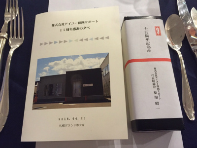 2016年4月23日 札幌グランドホテルにて、同業界の仲間(株)アイユー保険サポートさんの15周年感謝の夕べが開催され、弊社を代表し私佐野と伊藤大が参加させて頂きました。